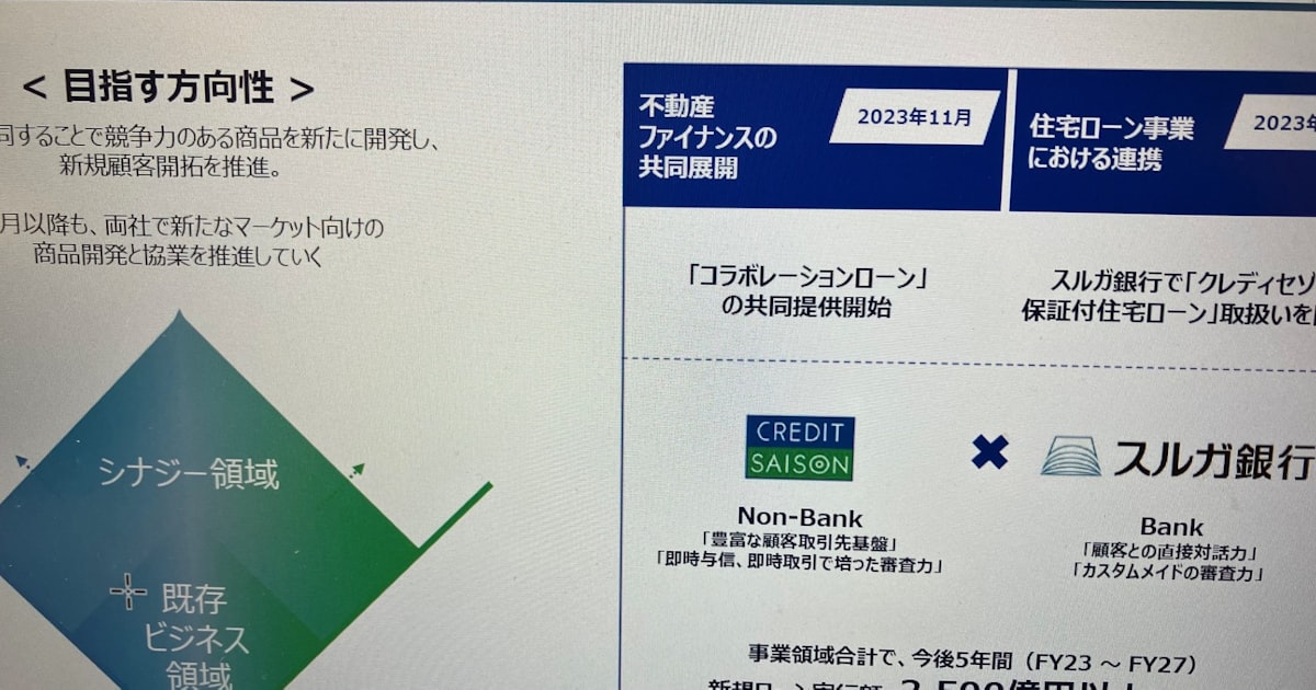 スルガ銀行は10日、2023〜27年度にクレジットカード大手クレディセゾンとの協業で3500億円以上の新規ローン実行を目指す構想を発表した。