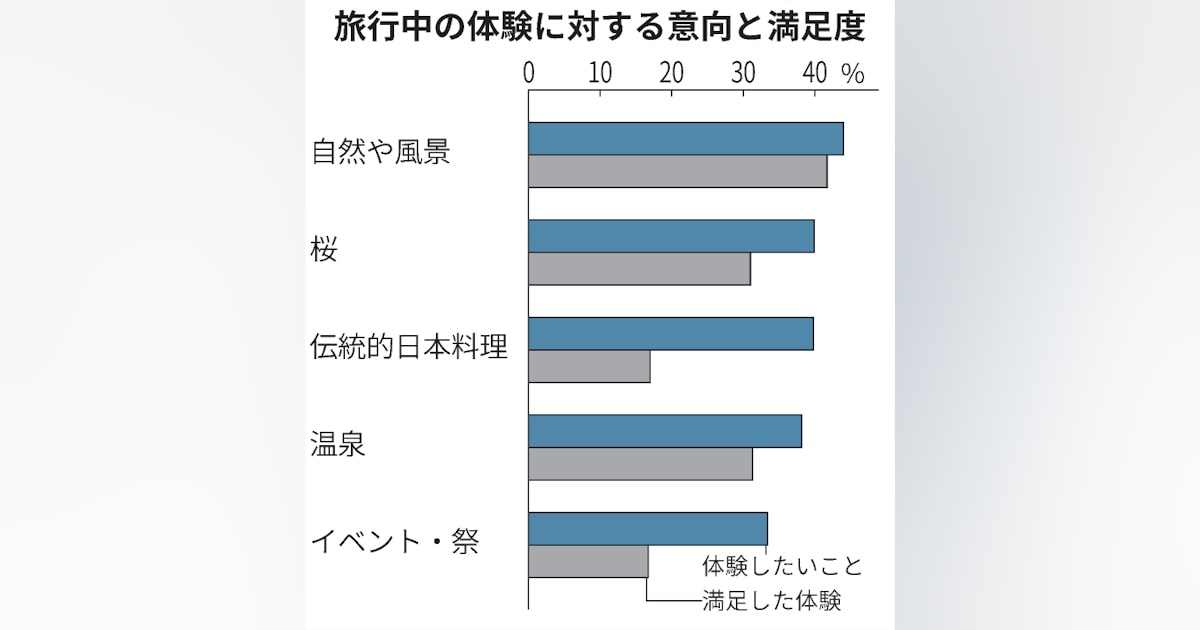 北陸3県の旅行を希望するインバウンド(訪日外国人)は「自然や風景」「桜」「温泉」といった体験を旅先で望んでいることが、日本政策投資銀行のリポートで分かった。「伝統的日本料理」「イベント・祭」も意向は多いが、実際に経験した人の満足度は低くなっていた。日本政策投資銀行と日本交通公社が7月に実施した調査から、アジアや欧米、豪州の北陸旅行希望者、経験者の回答データを抽出し、集計・分析