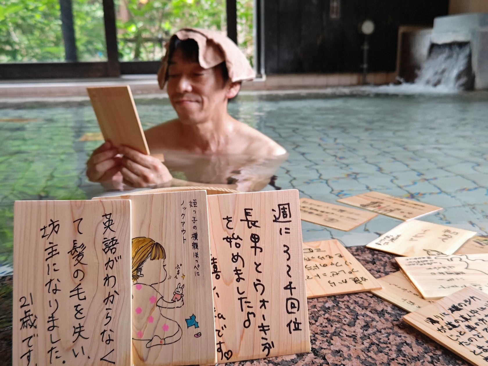 従業員の最近のニュースを書いたヒノキ新聞(入浴木)が男女浴室に浮かびます。入浴木には、埼玉県ときがわ町のヒノキ間伐材を使用します。 株式会社温泉道場.