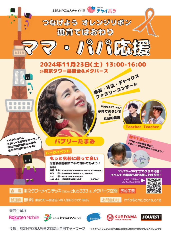 NPO法人チャイボラのプレスリリース(2024年11月15日 14時00分)孤育てはおわり ママ・パパ応援 in東京タワー&メタバース2024.