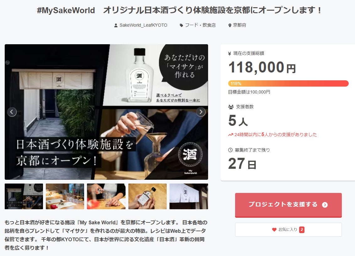 日本酒づくり体験施設「My Sake World」がクラウドファンディングを開始. プロジェクト開始から90分で当初目標金額を達成!期間終了まで引き続き全力でトライし …