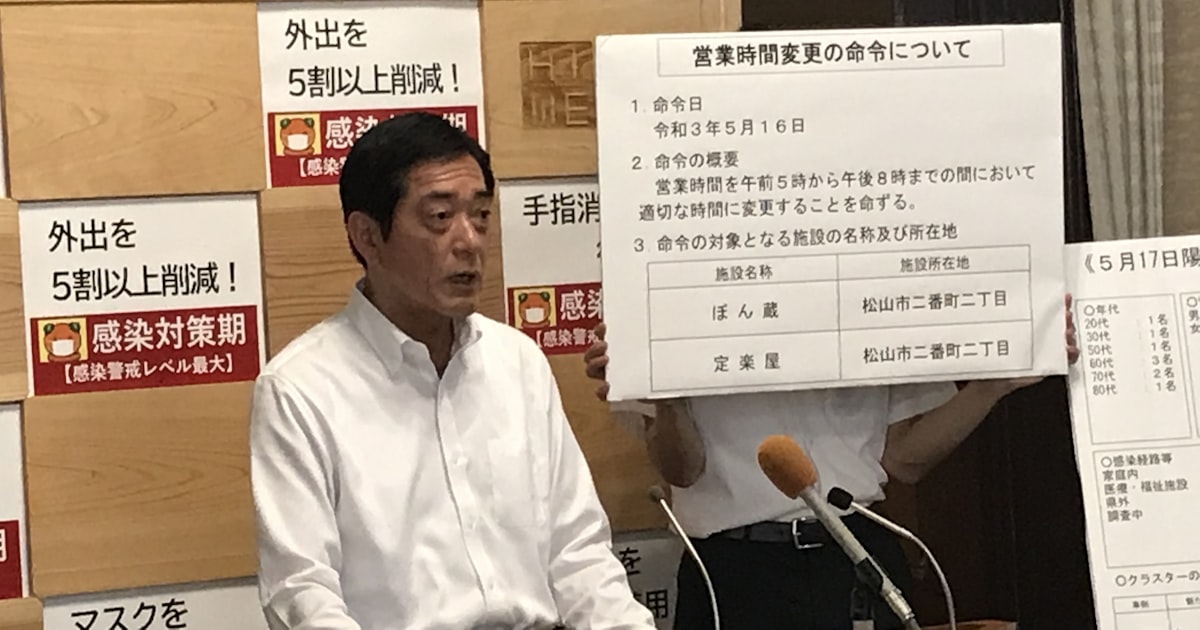 愛媛県の中村時広知事は18日、新型コロナウイルスのまん延防止等重点措置に基づく営業時間短縮の要請に応じない飲食店に、時短に応じるよう命令を出したことを発表した。松山市内の飲食店2店舗が対象で、県が繰り返し時短を要請したものの、午後8時以降も営業を続け、店内の感染防止対策も不十分なことから、特別措置法に基づ