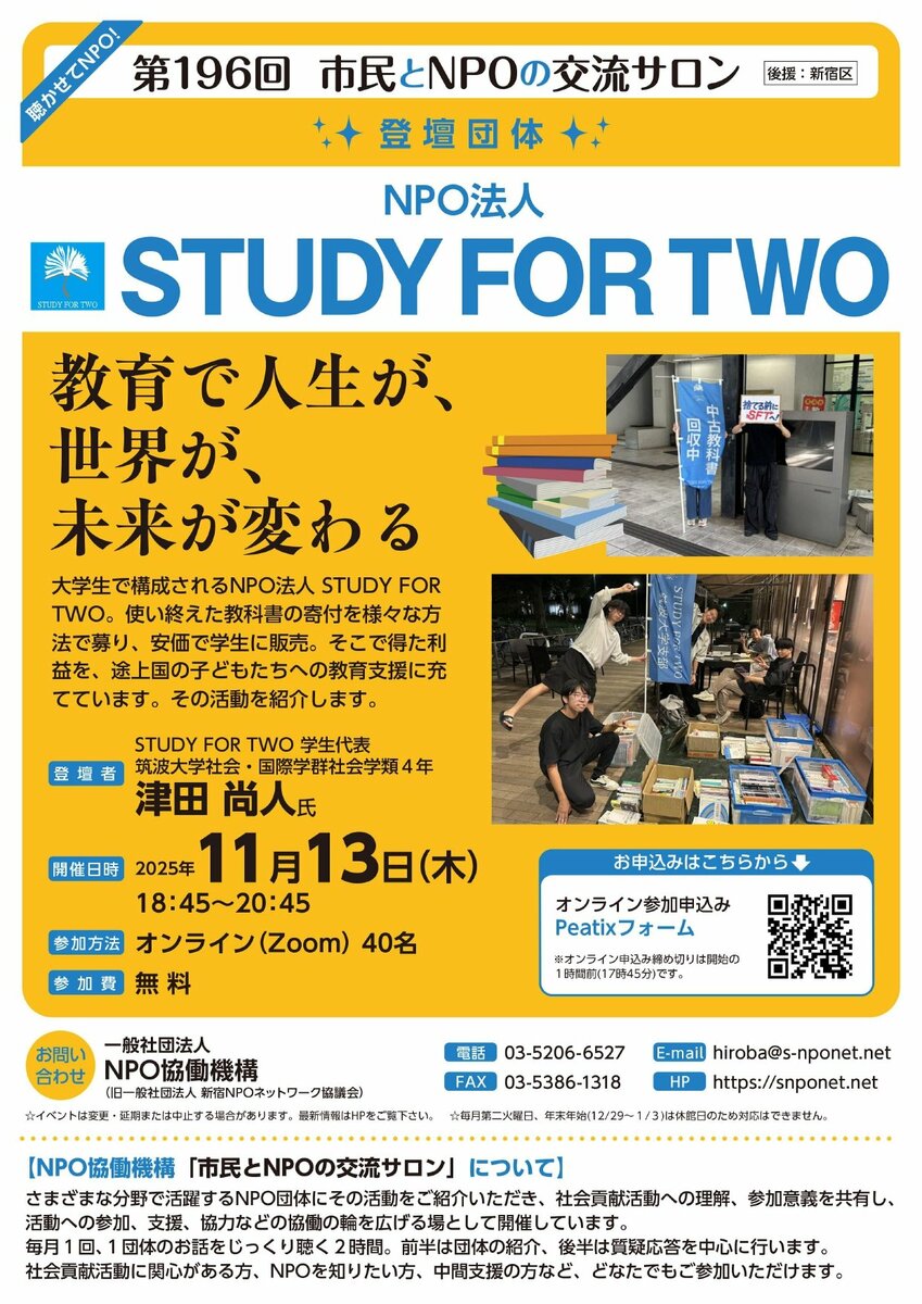 - 【第196回 市民とNPOの交流サロン】(登壇団体:NPO法人STUDY FOR TWO)を開催します!