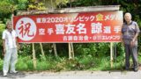 「やった! 金メダルだ」。東京五輪の空手男子形で、沖縄県勢初の金メダルを獲得した喜友名諒選手(31)の地元、沖縄市古謝自治会(知念信恒自治会長)は8日、「祝東京2020オリンピック金メダル・空手喜友名諒選手」の立て看板を、公民館前の市道古謝公民館線の南側に掲げた。
