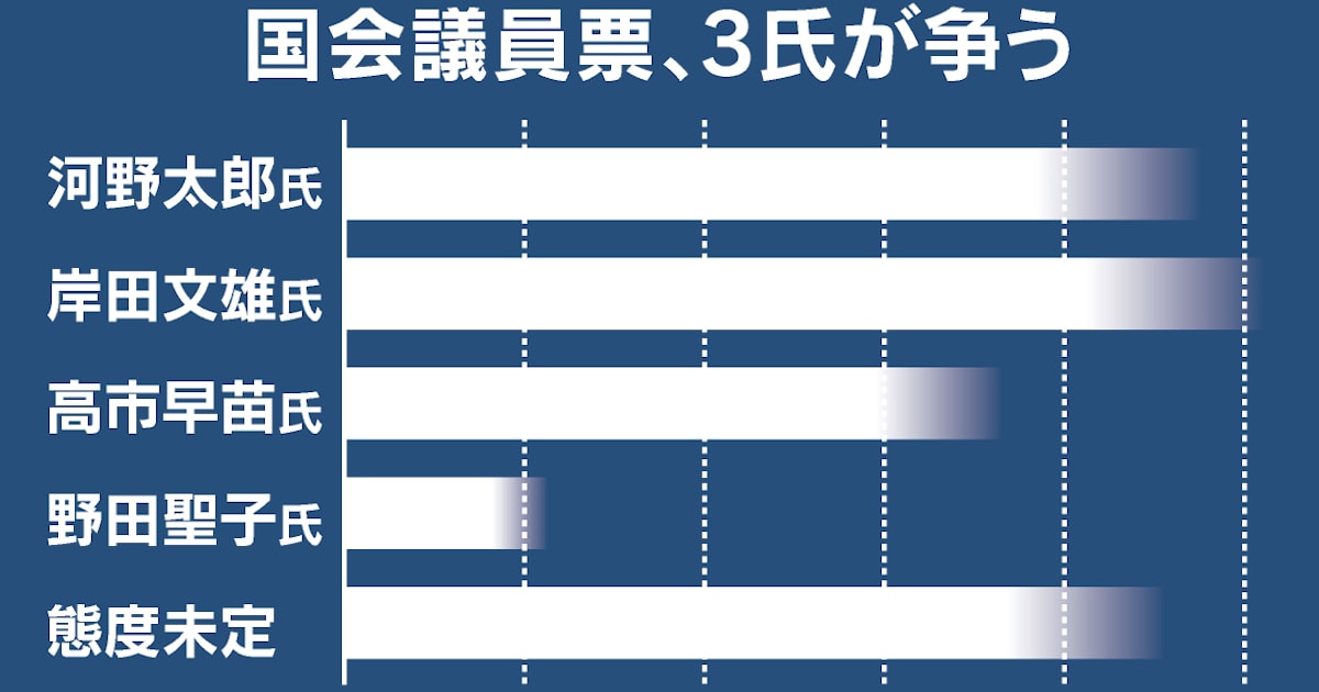 自民党総裁選は岸田文雄、河野太郎、高市早苗の3氏が国会議員票で先行する。議員票382票のうち、3陣営とも3ケタを目標に支持拡大を急ぐ。382票の党員・党友票の行方 …