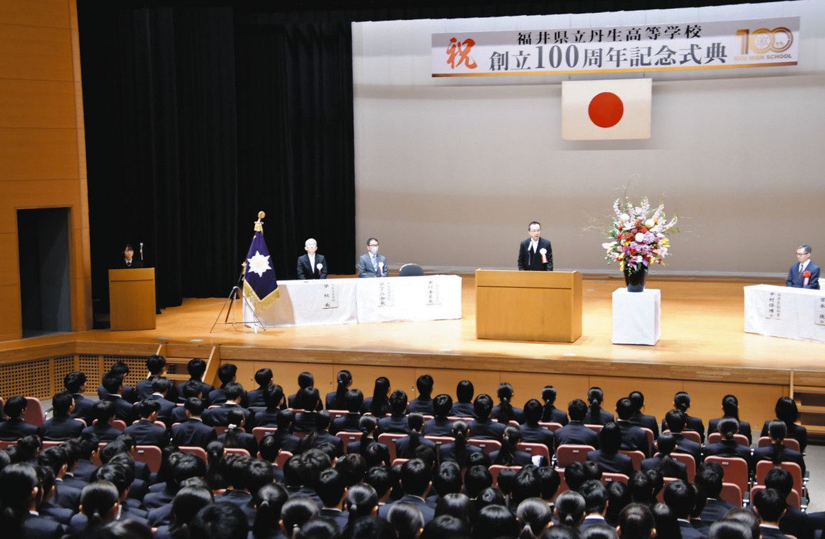 県立丹生高校の創立100周年記念式典が6日、越前町朝日多目的ホール(町生涯学習センター内)で開かれた。約300人の全校生徒をはじめ、卒...