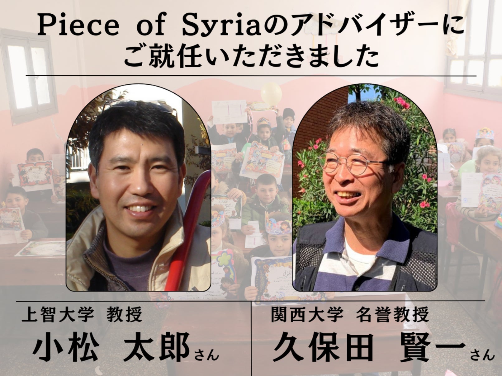 特定非営利活動法人 Piece of Syriaのプレスリリース(2024年4月5日 12時00分)NPO法人Piece of Syria 久保田 賢一教授(関西大学)、小松 太郎教授(上智大学)が教育事業のアドバイザーに就任