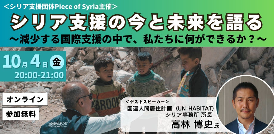 特定非営利活動法人 Piece of Syriaのプレスリリース(2024年10月1日 12時00分)減少する国際支援とシリア復興の未来を考える特別対談イベントを開催:UN-Habitatシリア事務所長高林博史氏と語る現状と展望