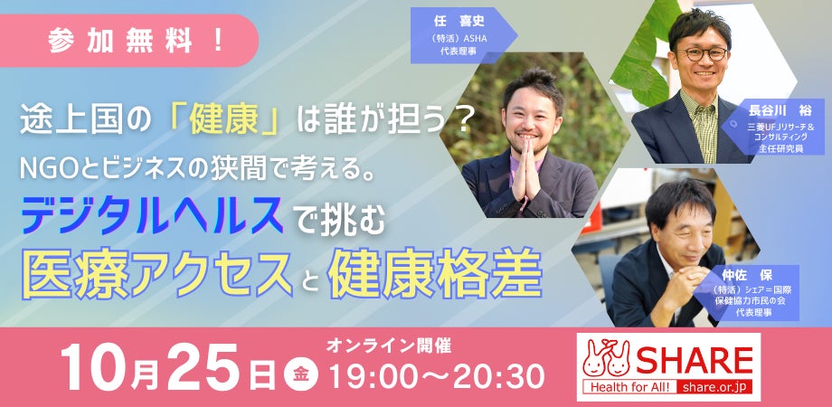 特定非営利活動法人 シェア=国際保健協力市民の会のプレスリリース(2024年10月18日 14時30分)10/25オンライン開催!<途上国の「健康」は誰が担う?>