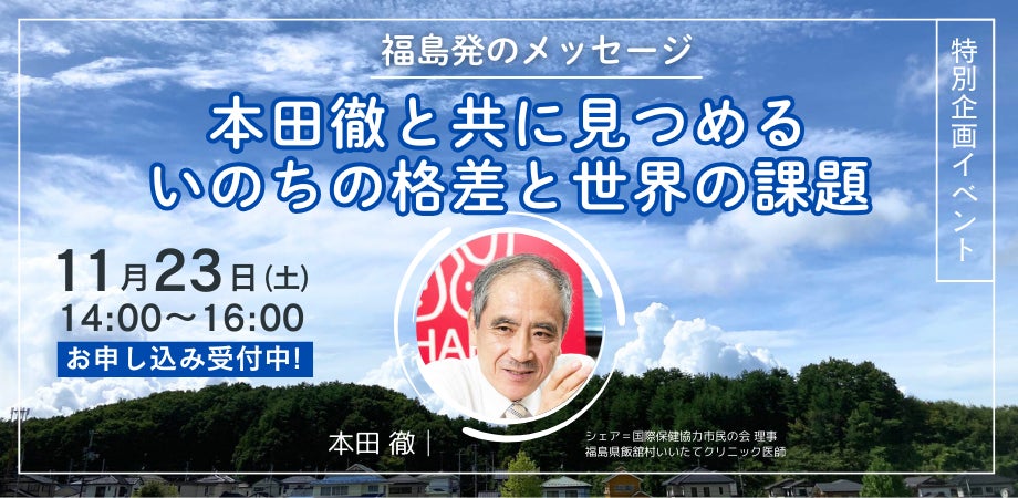 特定非営利活動法人 シェア=国際保健協力市民の会のプレスリリース(2024年10月18日 17時00分)11月23日東京開催!特別企画対面イベント「福島発のメッセージ:本田徹と共に見つめるいのちの格差と世界の課題」