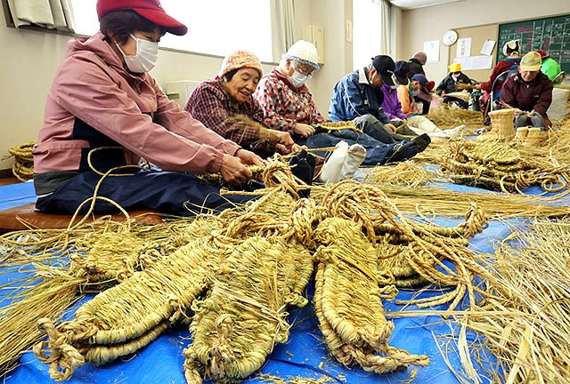 30日も上平老人クラブ連合会に所属する地域住民約40人が、手際良くわらを編んでいた。 今年は15~30センチのサイズの約300足を編む。わらじの …