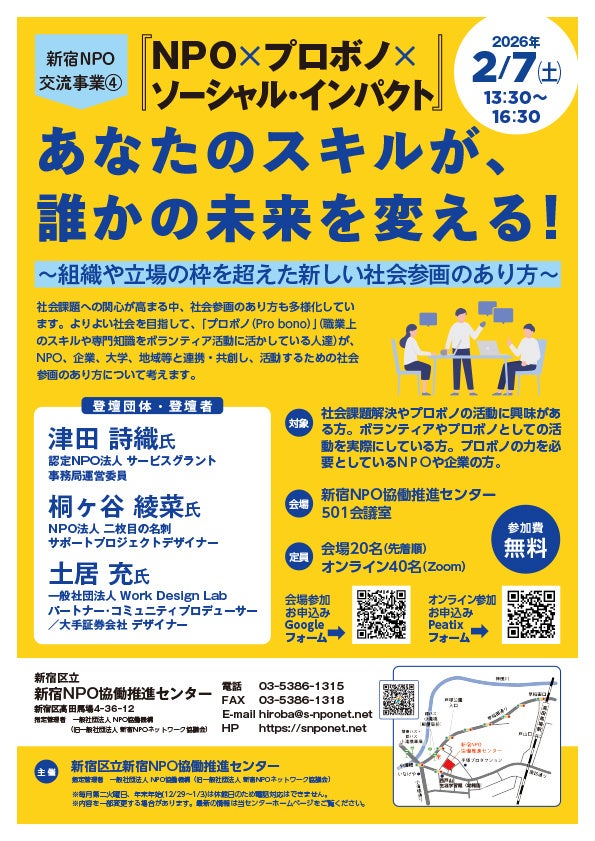 一般社団法人 NPO協働機構のプレスリリース(2026年1月28日 17時52分)【新宿NPO交流事業④】『NPO×プロボノ×ソーシャル・インパクト』「あなたのスキルが、 …