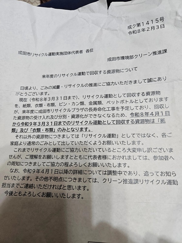 - 成田市リサイクル回収品の変更自治会定例会開催成田市より4月からビンカン - 選挙ドットコム