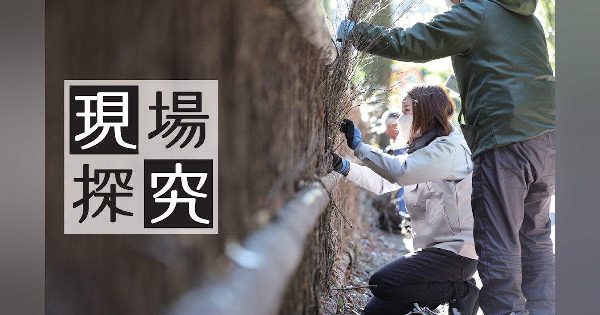 京都・嵐山の「竹林の小径(こみち)」に、ノコギリをひく音が響きわたった。昨年暮れのある日の朝。伐採した竹を切りそろえて小径の両側に柵をつくり、てきぱきと隙間に細い竹の枝を差し込んでいく。やがて高さ1.5メートルほどの穂垣(ほがき)が姿を現した。竹の合間から薄れ日が注ぎ込む幻想的な空間は、嵐山でも屈指の人気スポット。穂垣はその美しい景観を支える大切な存在だ。ただ観光客が竹林の撮影のために身を乗