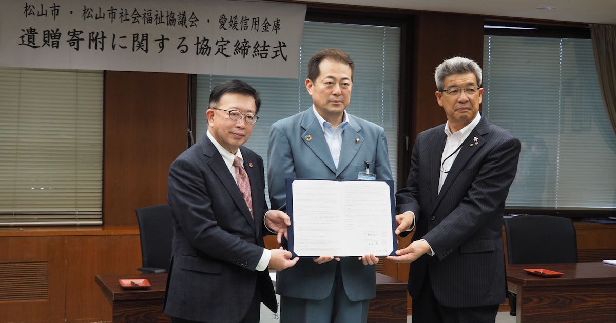 松山市は6日、相続人以外に故人の遺産などを寄付する「遺贈寄付」について、愛媛信用金庫(松山市)などと協力協定を結んだ。金融機関と組むことで、自治体 …