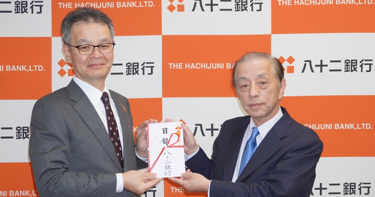 八十二銀行は24日、長野市内の本店で、認定NPO法人のフードバンク信州(長野市)への寄付贈呈式を開いた。同行は投資商品「はちにのスマイルボンド」の販売額に応じて、収益の一部を慈善団体などに寄付することとしており、同法人への寄付は2回目となる。金額は非公開。フードバンク信