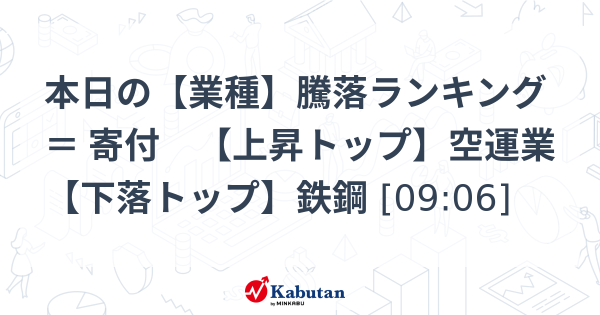 - 【市況】本日の【業種】騰落ランキング = 寄付 【上昇トップ】空運業 【下落トップ】鉄鋼 [09:06]
