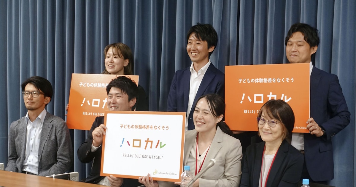 「体験格差」を解消するプロジェクトへの寄付を呼びかける「チャンス・フォー・チルドレン」の今井悠介代表理事(後列中央)ら(7月、東京都内)=共同.