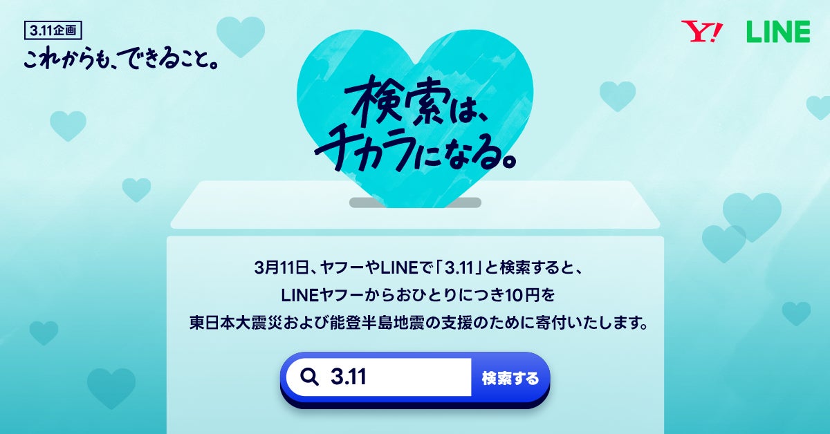 ヤフー」や「LINE」で『3.11』と検索すると東北や能登への寄付につながる取組み「検索は