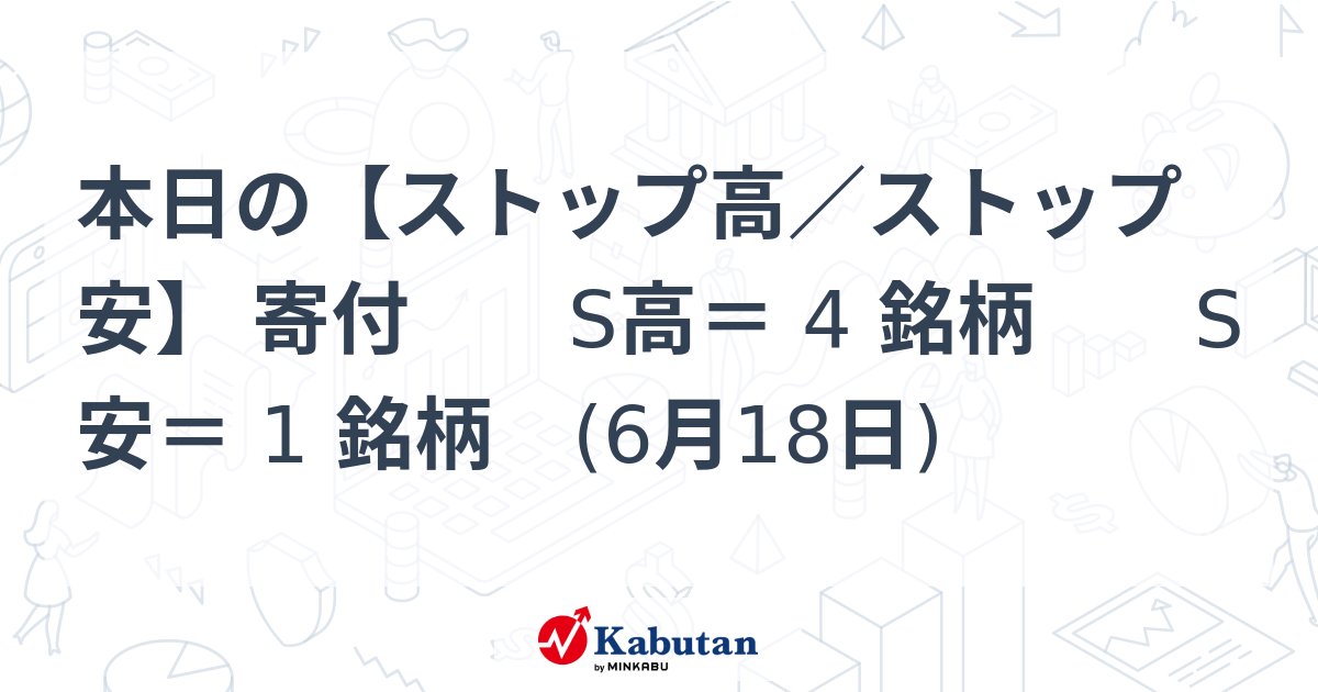 - 本日の【ストップ高/ストップ安】 寄付 S高= 4 銘柄 S安= 1 銘柄 (6月18日) - 株探