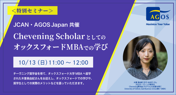 <特別セミナー>JCAN・AGOS Japan共催 Chevening ScholarとしてのオックスフォードMBAでの学び 10/13(日)開催