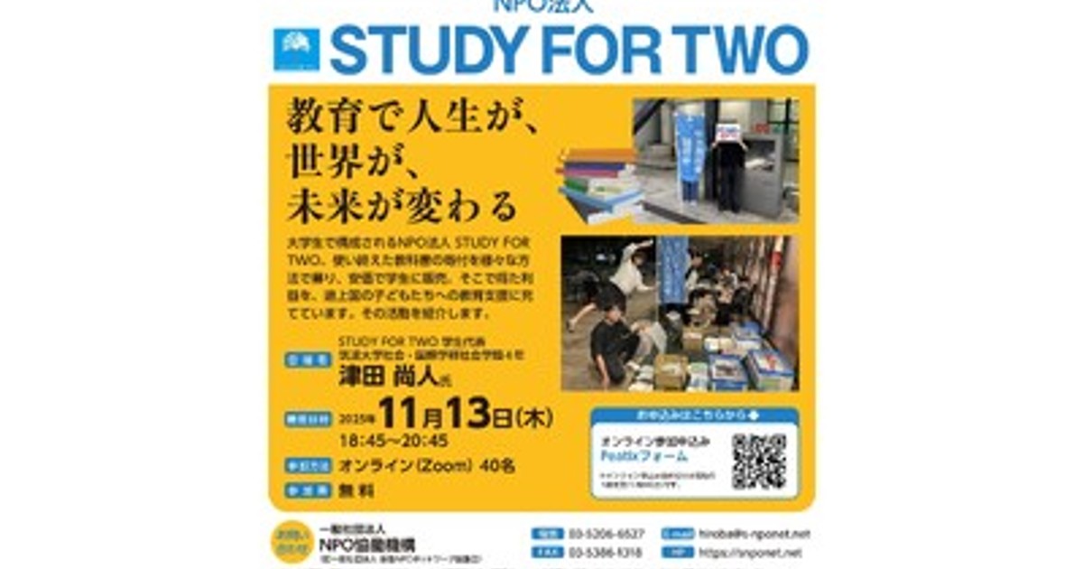 - プレスリリース:[第196回 市民とNPOの交流サロン](登壇団体:NPO法人STUDY FOR TWO ...