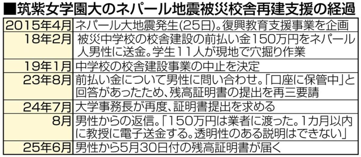 - 筑紫女学園大のネパール復興支援が中止、寄付金150万円が未返金 「事業に疑義を呈されるのは ...