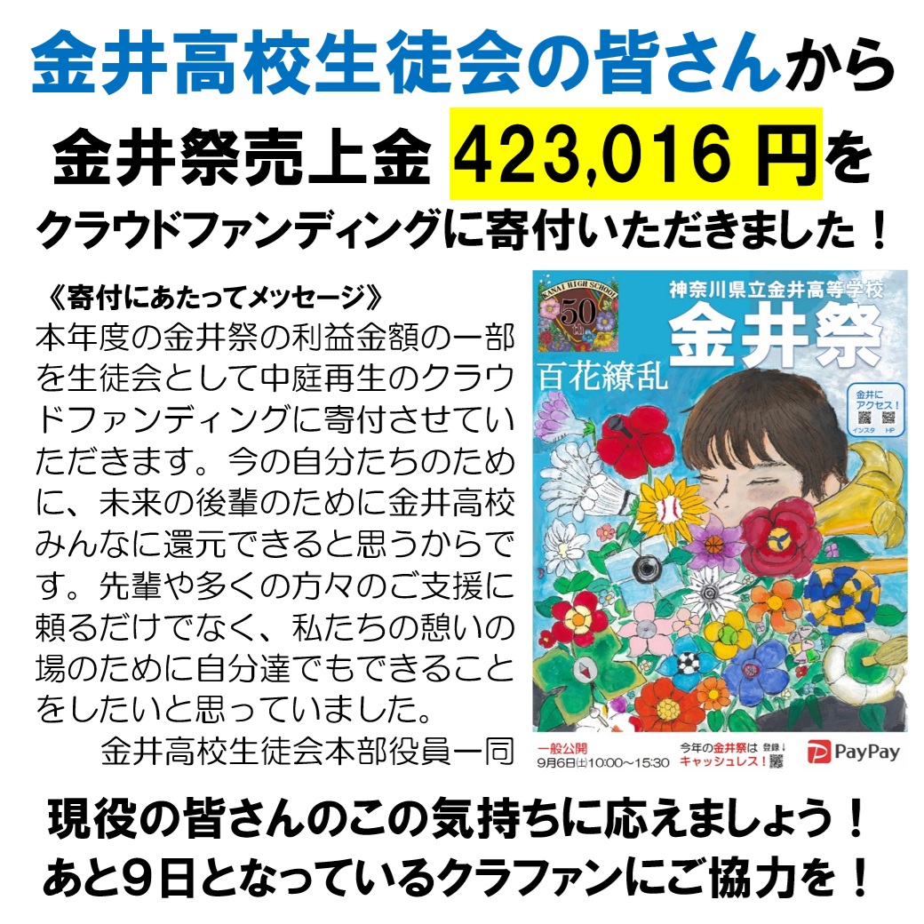 - 金井高校生徒会の皆さんから金井祭売上金423016円を本プロジェクトに寄付いただきました!