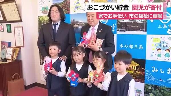 困っている人のために役立ててもらおうと、静岡県三島市で幼稚園児が1年間貯めたおこづかいを市に寄付しました。市役所を訪れたのは「のびる幼稚園」の子供 …