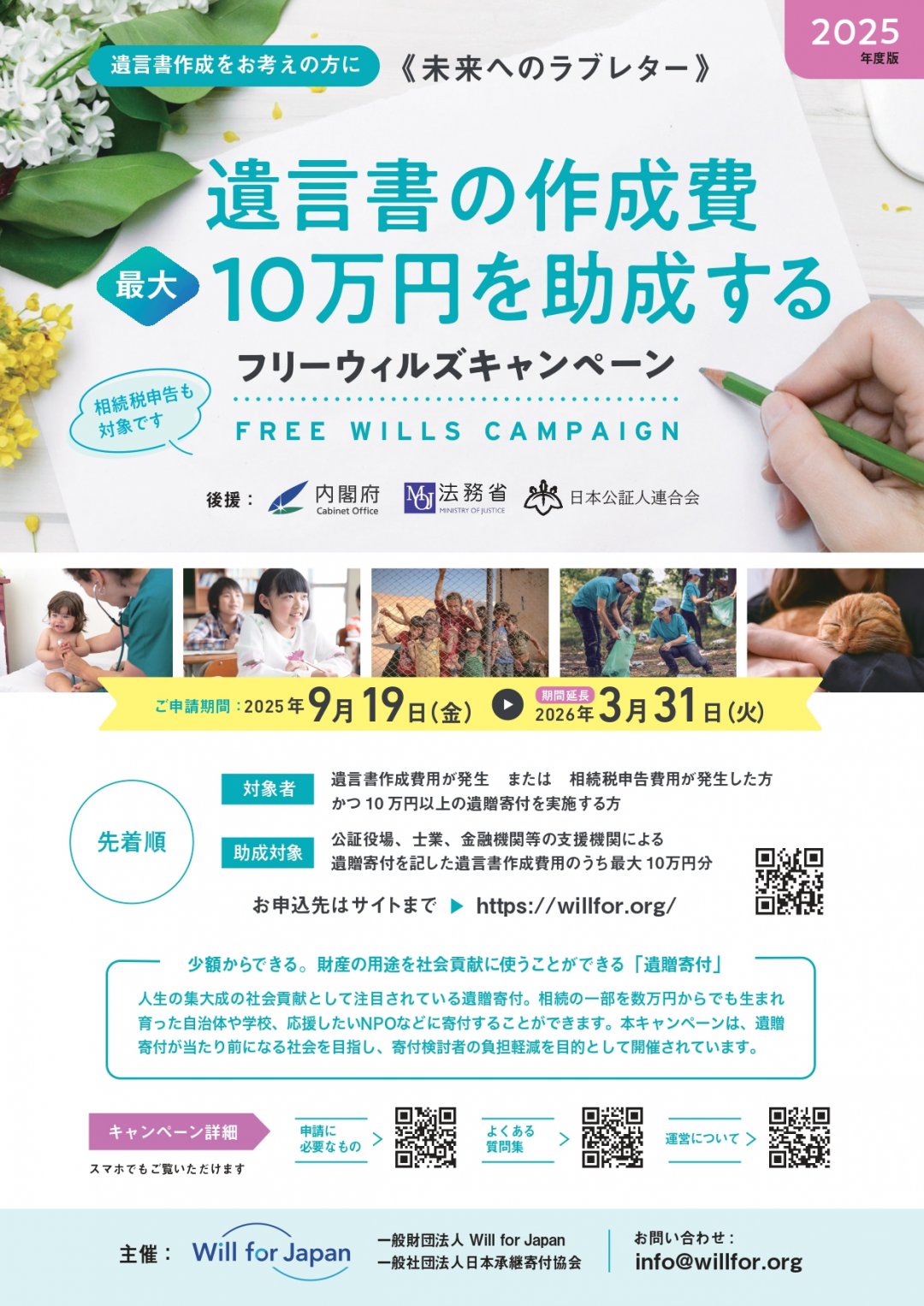 - 【期間延長!3月31日まで】寄付遺言書作成に10万円の助成/フリーウィルズキャンペーンご案内