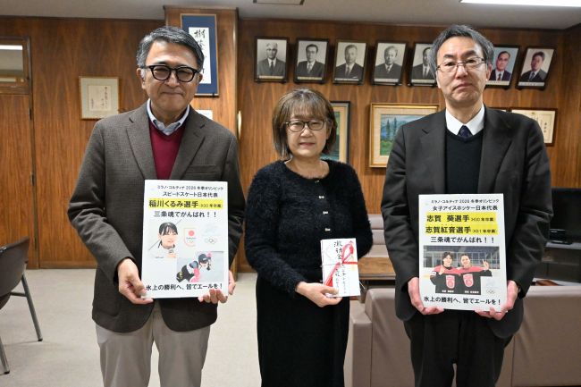 帯広三条高校常磐同窓会(遠藤明徳会長)は6日、ミラノ・コルティナ五輪に出場している同校出身の選手3人を激励しようと集めた寄付金の贈呈式を、同校で行った。