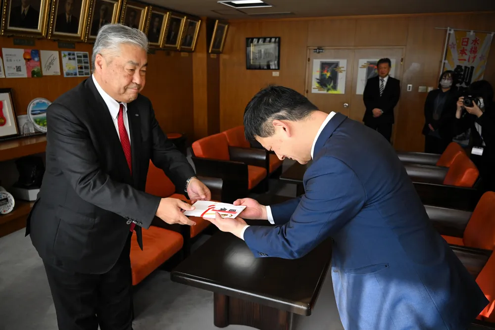 今回の寄付金について中村市長は「あらゆる分野で子どもたちの支援をしていかなければならないので、関係部署と話し合いながら有効に活用していきたい」と感謝を …