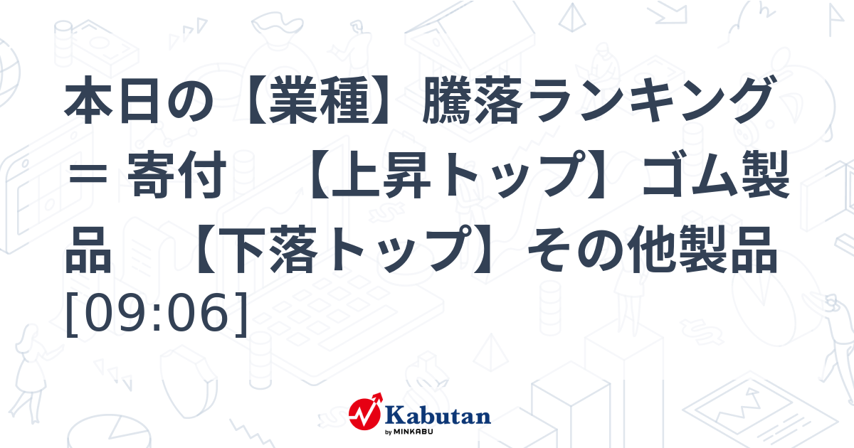 - 本日の【業種】騰落ランキング = 寄付 【上昇トップ】ゴム製品 【下落トップ】その他製品 [09:06]