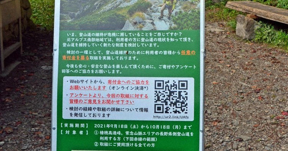 実証実験で登山者に寄付金を募る立て看板=長野県安曇野市の北アルプス・常念岳登山口で2021年9月23日、武田博仁撮影. 長野県北アルプス南部の登山道維持・ …