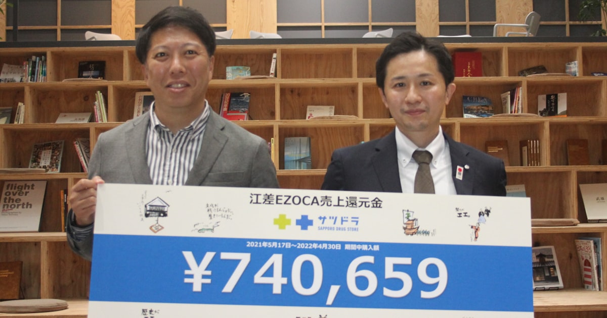 サツドラホールディングス(HD)は23日、北海道江差(えさし)町に売り上げの一部を寄付する贈呈式を開いた。寄付額は74万円強。サツドラ店舗の支払いに充てたポイントカード「江差EZOCA(エゾカ)」のうち、0.2%を町に還元した。富山浩樹社長は「江差町の取り組みを他自治体にも広げたい」と語った。江差エゾカ