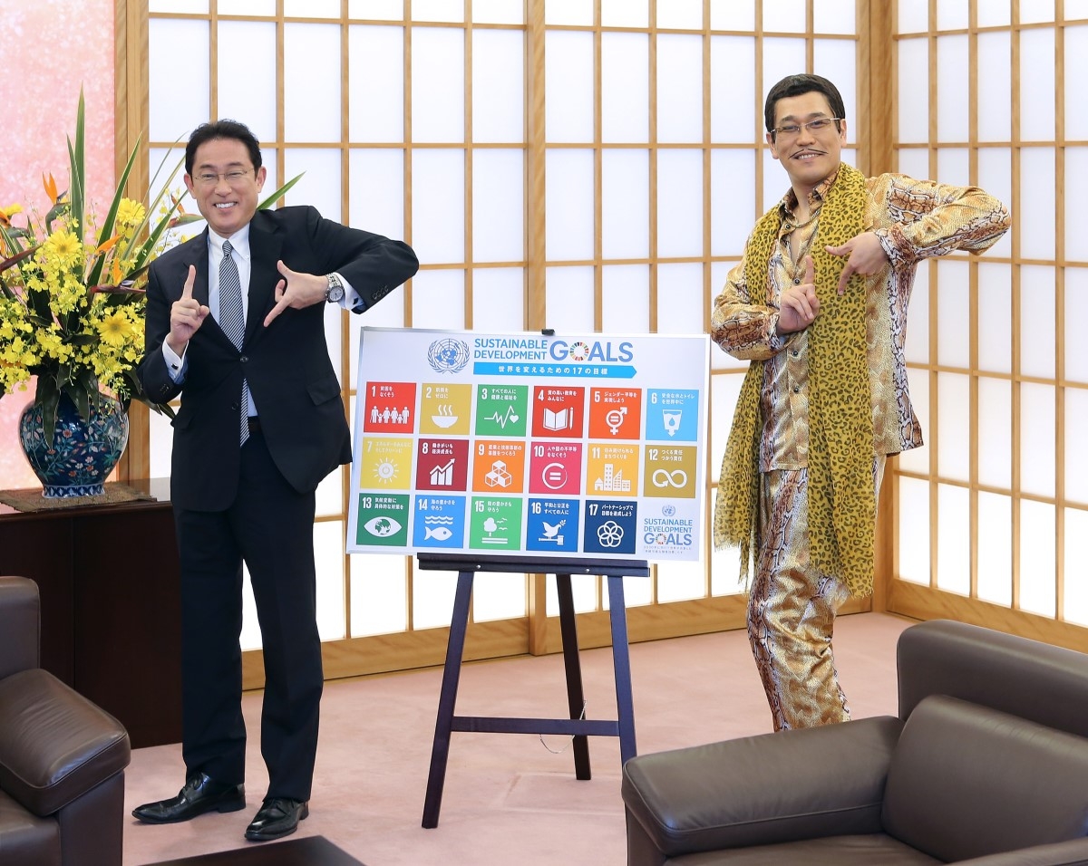 2017年7月、「持続可能な開発目標(SDGs)」のPRのためピコ太郎さんが岸田文雄外相(当時)を表敬訪問(イメージ、Sipa USA/時事通信フォト).